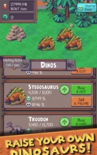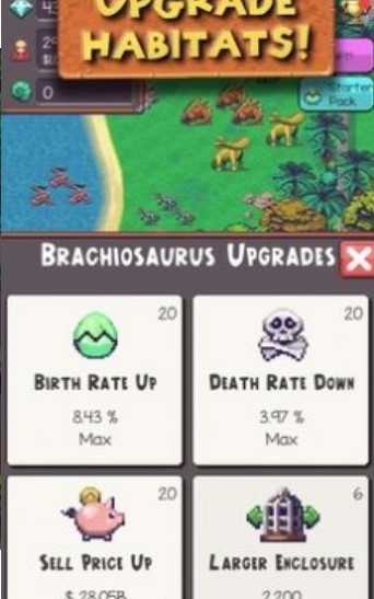 所有的恐龙都能够逐步升级,生存率和售价都能够有效的提高,并且自己的恐龙还可以出售,从而能够将更多的宝石顺利的获得。