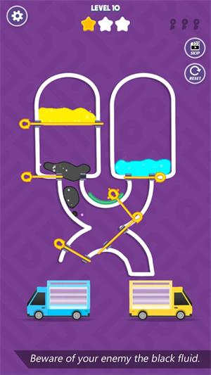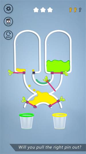 3、各种颜色的液体在重力作用下会下落,合理取出销钉即可完成更多关卡。