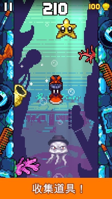 小乌贼漂流记作为一款休闲闯关类型的游戏,在游戏里玩家在该游戏中可以进入到一个海底的世界之中,你能看到各种海洋的环境和生物都被呈现为了一种像素的风格,在游戏里玩家可以在游戏里操作的是一只小乌贼,你想要从海沟中不断向上浮动,还要躲避周围的水雷和障碍物。感兴趣的用户就来这里进行下载和游玩吧!