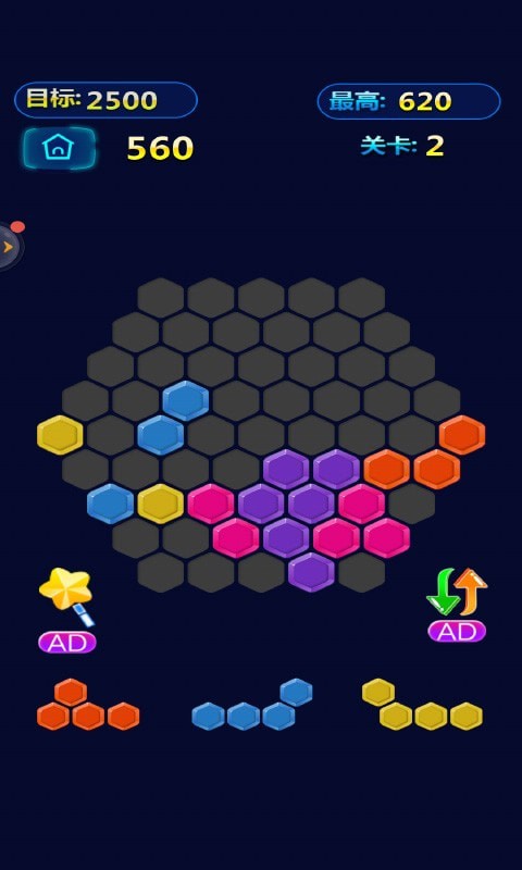 2)两种模式选择:用户可选择拖入六边形拼图完成关卡,或连成横线进行消除得分。