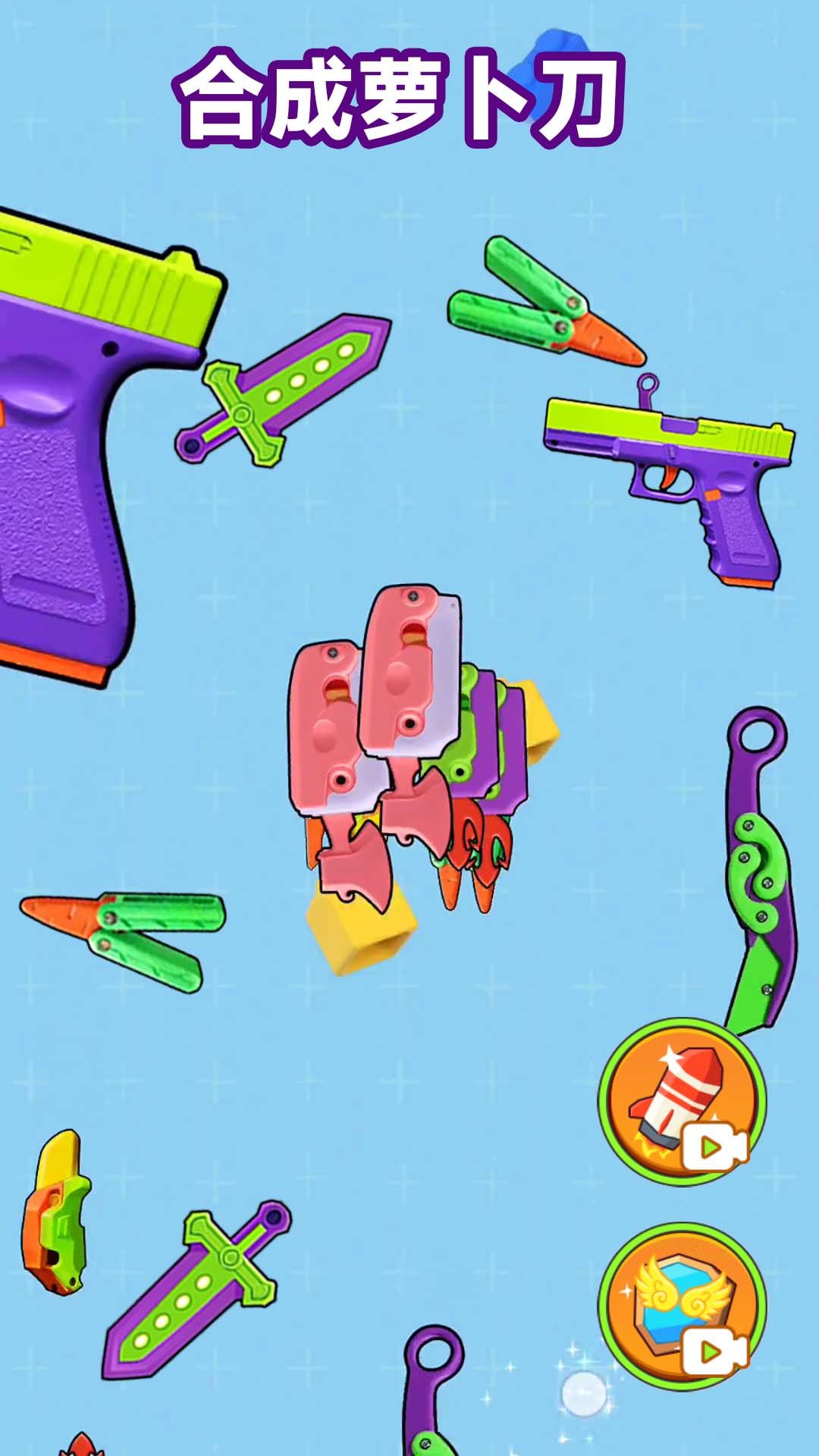 1、合成萝卜刀是游戏的核心玩法,在游戏里玩家需按照合成要求,不断升级和改进自己的萝卜刀。