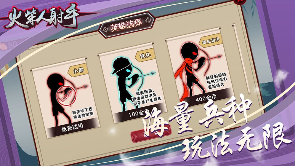 画面精美,打击感超强的一款射击类游戏,拥有无尽模式和通关模式,选择一名英雄和一把武器,开启你的射击之旅!面简约精美,拥有小黑、铁头、猎手、毒蝎等英雄人物,更有多种炫酷武器!快拿起手中的武器感受真正的射箭体验吧!