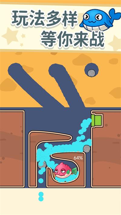 同学帮帮它作为一款卡通风格的益智、休闲、救援和关卡突破游戏,一条小鱼被困在一条小水沟里,即将面临危险。你想要帮他回到湖边,在游戏里玩家必须尽最大努力挖掘渠道,将水引到小鱼的位置,在游戏里玩家需要了解地图机制才能成功通关,还有非常有趣的关卡等着你挑战,如果你喜欢,现在就来下载。