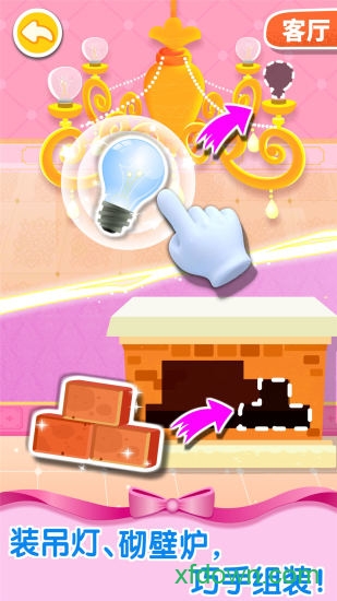 2、给自己的城堡装上吊灯并且砌好壁炉,快来运用自己的巧手组装吧。