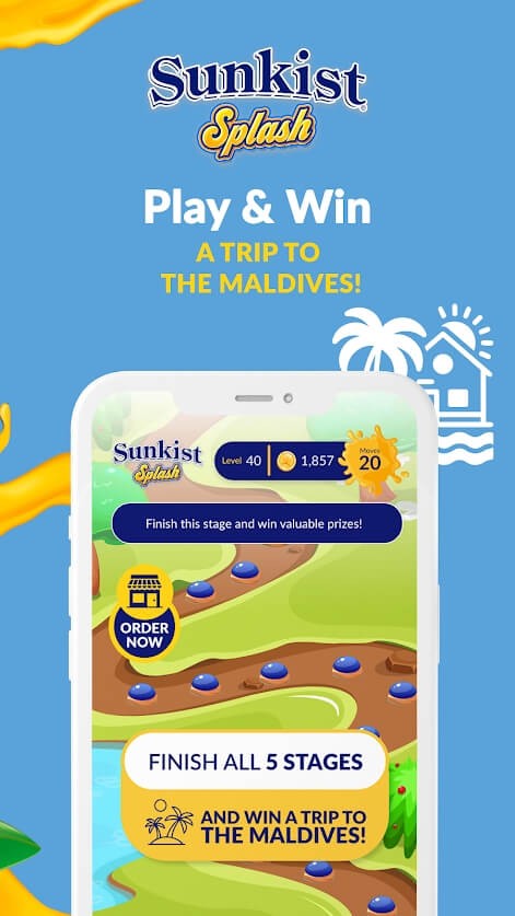 新游戏,它将让您大呼过瘾,并让您不断回来,直到您赢得马尔代夫的黄金之旅!现在就开始玩水吧!阳光飞溅Sunkist Splash探索新奇士的飞溅世界!一个有趣且有趣的益智游戏,需要战略性的快速思维。匹配美味的水果,进入下一个级别并获得宝贵的奖品!保持警惕,快速思考并解决这个难题!每当它变得棘手时,您可以随时前往商店购买助推器,以帮助您克服障碍。