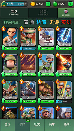 近七十种不同军战卡牌等你收集,装甲坦克、机枪导弹、各式兵种应有尽有,研究各种卡牌之间的搭配策略,排兵布阵,组装出最强的王者之师!