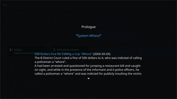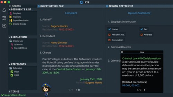 - 资料查阅:查阅资料并利用搜索引擎寻找法条,玩家最终会知道谁是真正的罪犯。