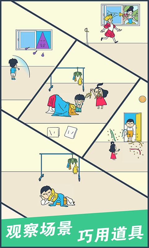 点击床边的扫帚,镜头转到右侧,点击桌上的剪子,镜头转回左侧。用剪子剪开玩具熊,用扫帚把地扫干净,点击玩具熊自己钻进去,这样老班就找不到你啦。