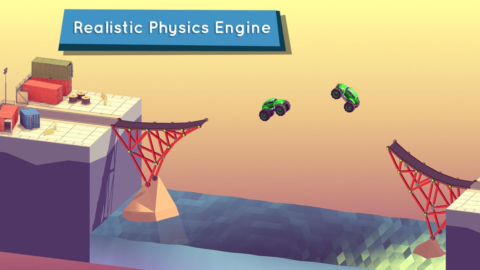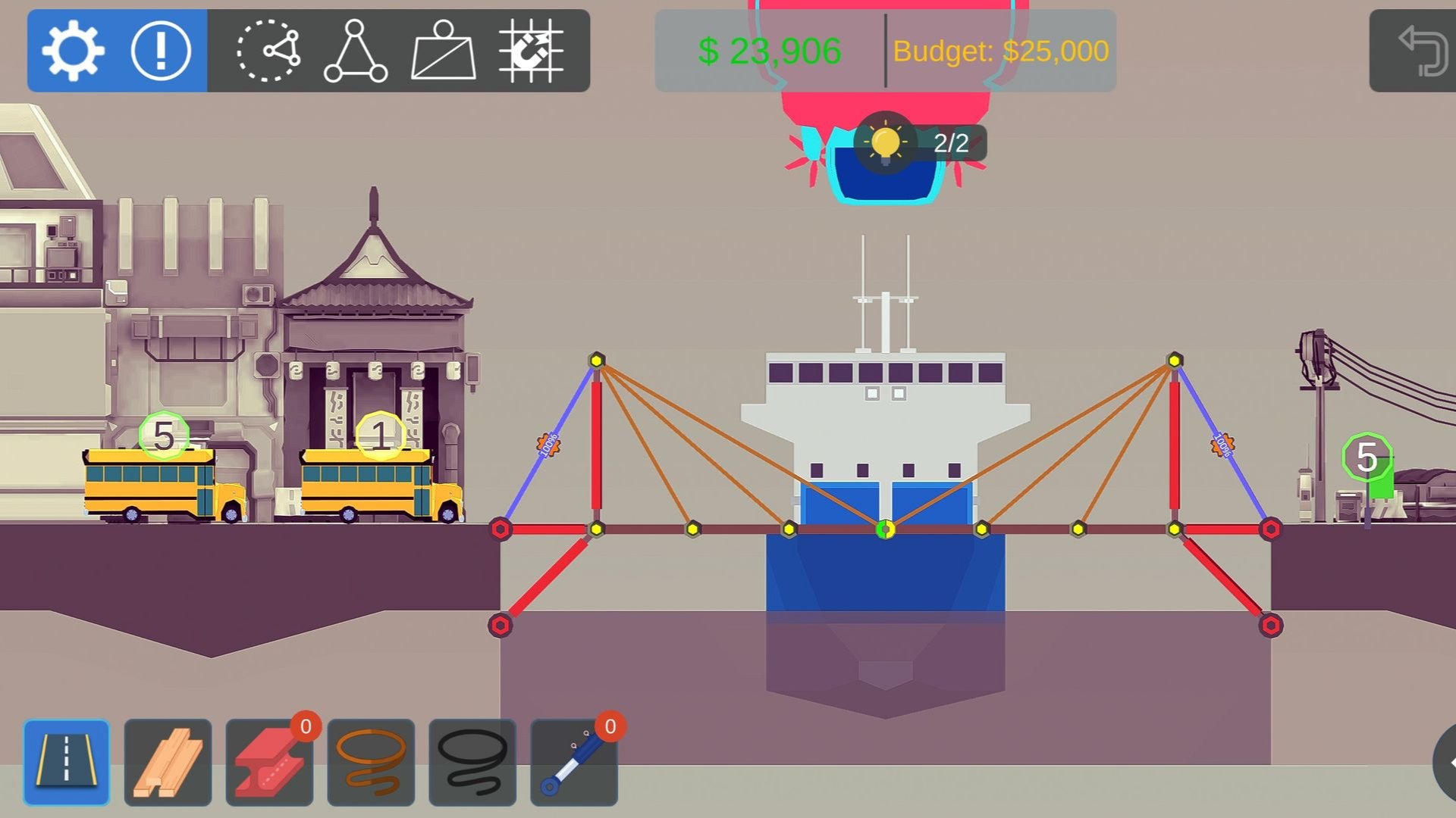 造桥模拟器玩起来是非常的烧脑益智有趣的,以搭建桥梁的方式来完成闯关的挑战任务,帮助不同的车辆到达对岸,在预算以内完成闯关就可以过关,不断的实验以最少的预算完成闯关还可以去挑战排行榜。