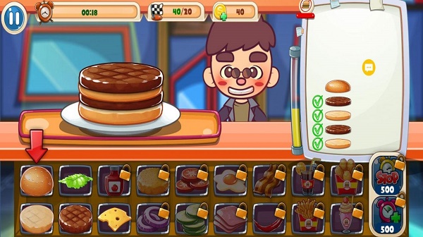 5、你将要给挑剔的食客制作出美味的汉堡,获取的酬劳去购买解锁新的食材,从而做出各式各样的美味汉堡。游戏很好的还原了汉堡的制作过程,从制作面包、切菜、烤肉等全部都要手动完成,当然了速度要快,不能让客人就等哦