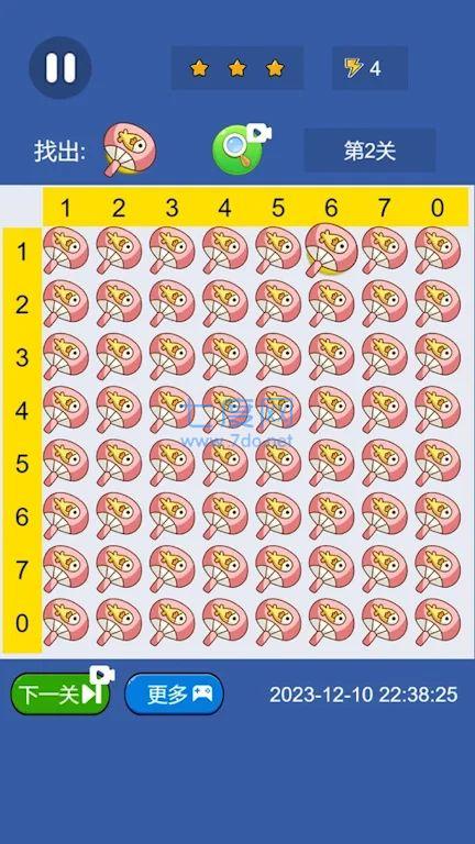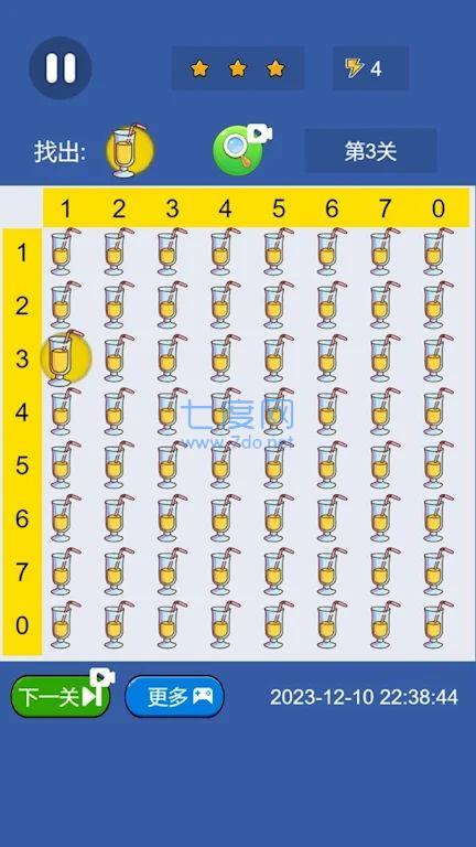 开心找茬作为一款在游戏里面找不同的游戏,这作为一款考验用户眼力的游戏。在游戏里面用户可以看到64杯橙汁,在游戏里玩家的目标就是在其中找出一个与其他63个不一样的橙汁,只要找出来就可以通关,在上方可以看到用户这关要找出来的目标和通关关数。