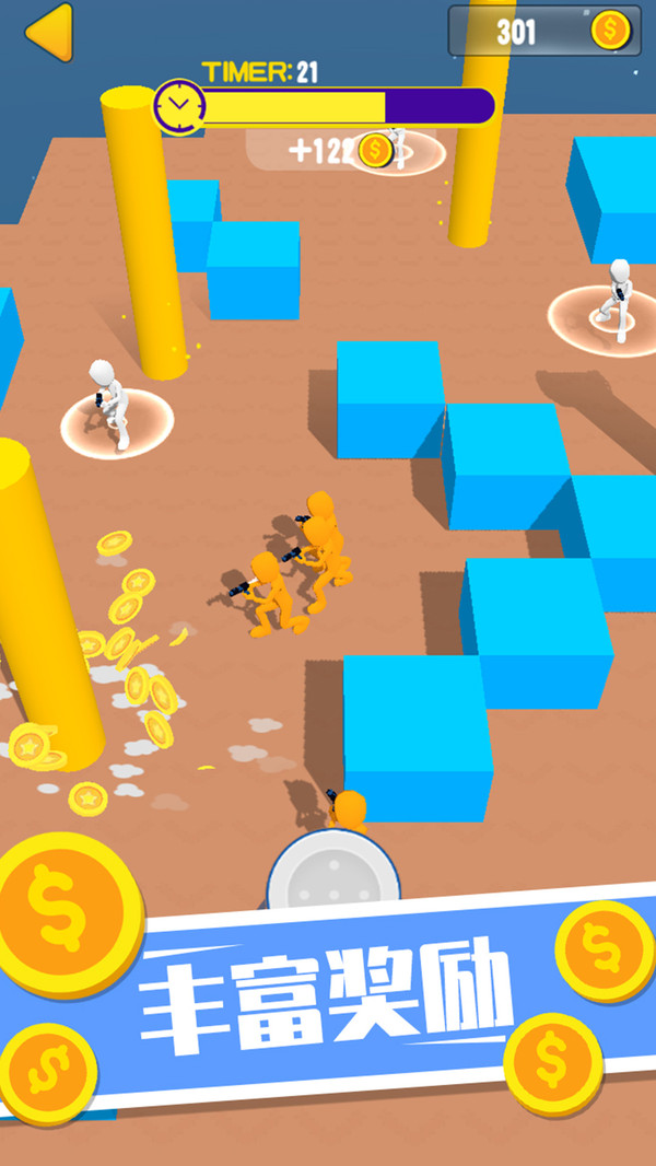 反恐特战队是一款枪战射击闯关类游戏,玩家在游戏可以通过寻找地图中散乱的小人转化为队友使自己的战力变得强加强大,使用人数的优势和走位消灭关卡中的小怪以及boss获得胜利。