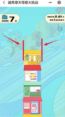进入活动页面后稍等几秒,按提示登录、助力,然后开始游戏。如果一直不显示『为他助力』的话需要多刷新,或换个时间再试。每天有3次机会玩盖楼小游戏,今天是必中,明天就不知道了。游戏技巧,楼房会变大变小,每一层都需要比下面的一层小,超大就算失败。楼房变大变小的时候在左右两边会显示下面一层的边界,我们在房子接近边界的时候点一下,让他盖下。玩到5层有0.81元红包,玩到8层有1.18元红包,玩到10层有1.81元红包……能赚多少就看各人能力了。