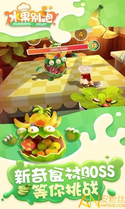 玩家在里面扮演厨师来砍杀小怪,搜集碎片,完成各色可爱的水果食材收集。每个关卡设置一个美味的大Boss进行挑战,选择你的一个战斗武器,用菜刀或者是大勺子等砍,如果挑战成功,就可以大大提升厨师等级,还能获得礼包大奖!