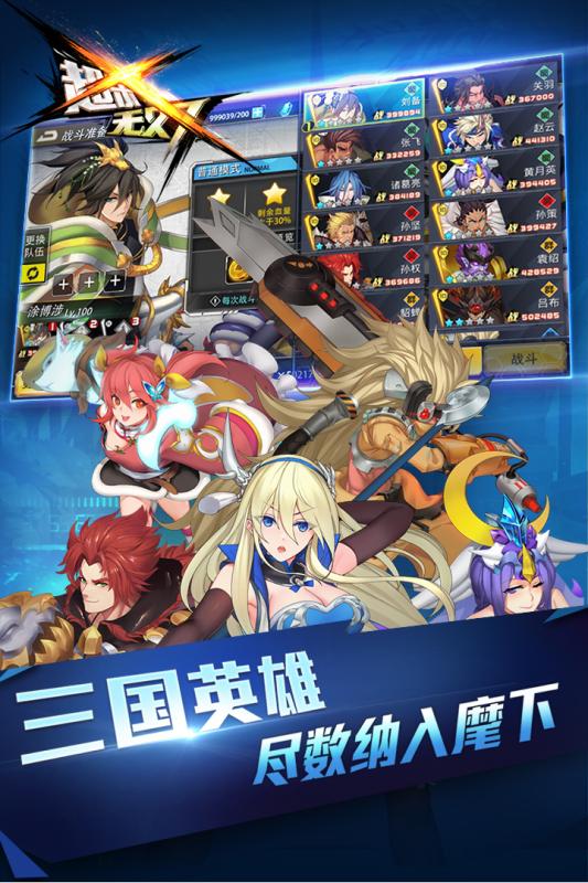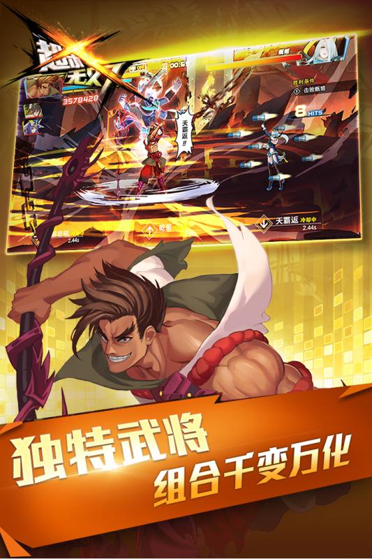 超爽快连击手游超杀无双华丽降临!颠覆传统摇杆操作,开启全新划屏时代!一秒七刀,无限斩杀,光速划屏,连击超神!海量名将闪亮登场,有颜又有料!组合三人小队,自由切换搭配百变!更有武将无双大招,超炫技能闪爆荧屏!后宫美女如云,约会调情天天不重样!享受视觉盛宴,体验爽快连击,赶快来将各路英雄纳入麾下,带领他们征战天下!