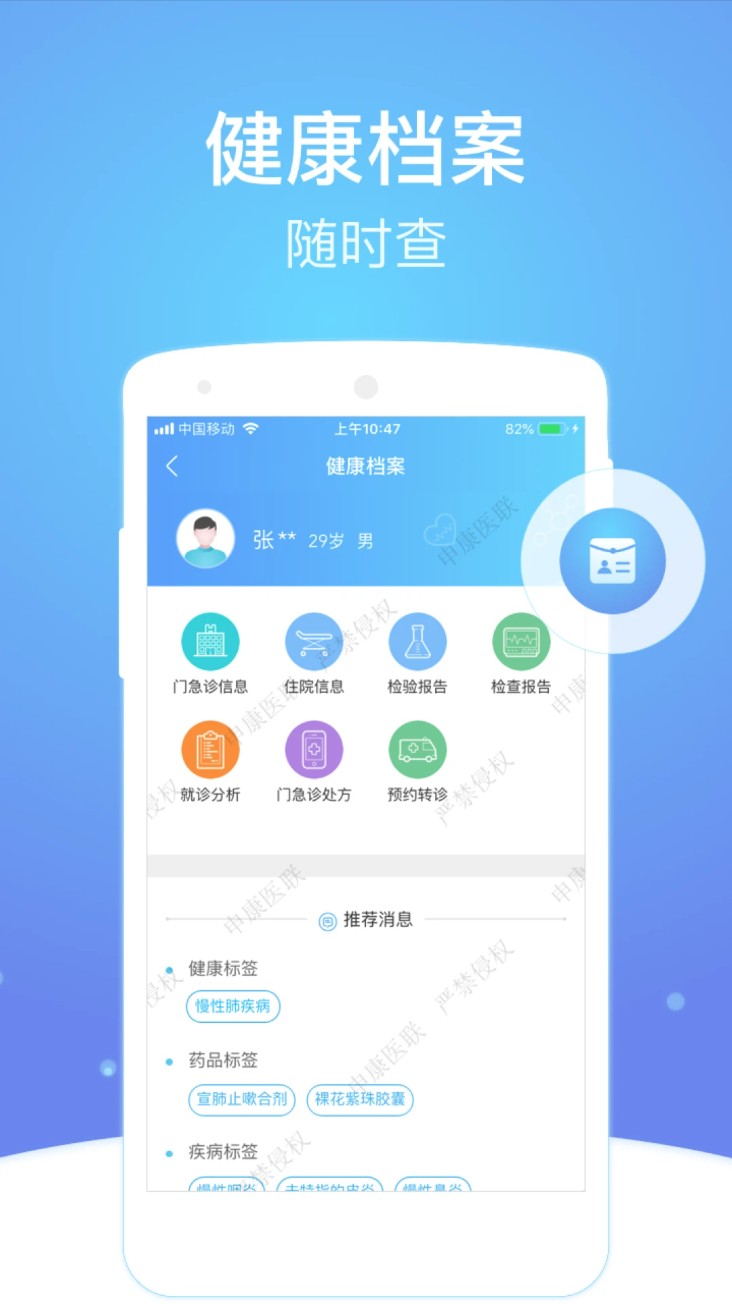4. 进入“我的”页面后,可查看健康档案、预约记录,支持管理签约医院及就诊卡信息。