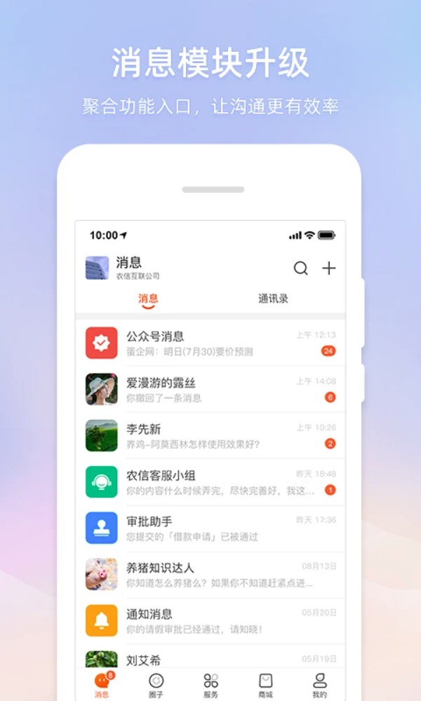 使用智农通可以享受免费聊天、发语音、图片等服务。智农通可以帮您轻松管理圈子,建立群聊、私聊,接受各类消息,并且支持发送文字、图片、语音、文件等格式。与猪联网、进销财、企联网无缝对接,通过移动端管理您的猪场、店面和企业。同时也是您的移动端轻办公系统,您可以轻松分配工作、撰写工作报告,处理审批事件、报销费用、收发邮件等。非常便捷实用!