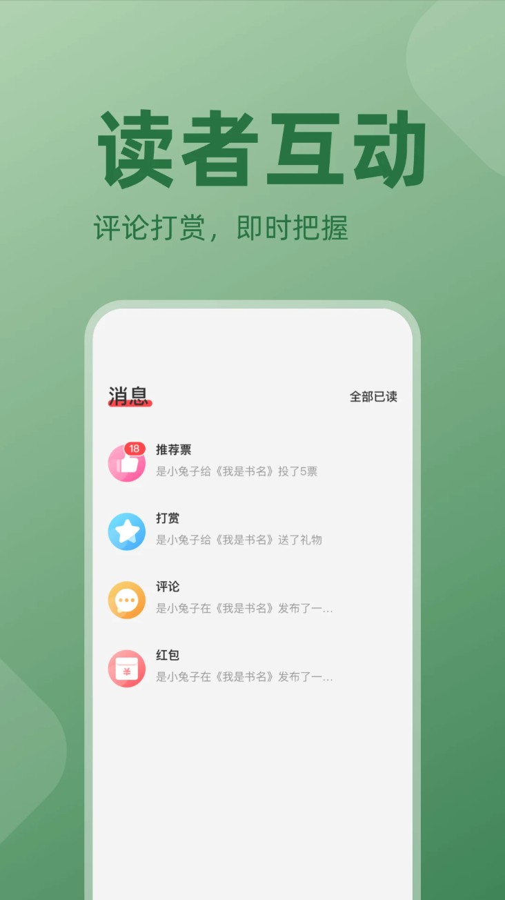 5. 在“消息”中接收评论、打赏、推荐票等互动通知,随时了解读者反馈并保持高效互动。