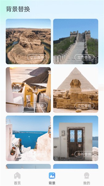 3、点击底部“背景”栏目可进入背景替换页面,自由选择喜欢的图片进行“立即替换”。