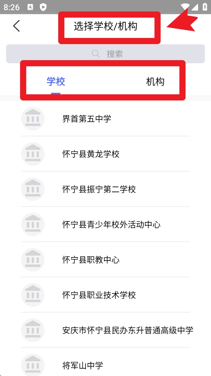 1. 初次使用时需选择所属学校或机构,可在“选择学校/机构”页面中搜索名称后点选绑定,完成后方可进入各项功能。