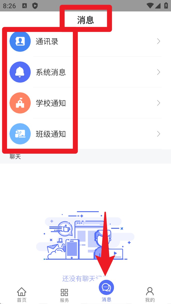 2. 点击底部“消息”按钮进入消息中心,可查看系统消息、学校通知与班级通知,支持分项分类管理与未读提醒。