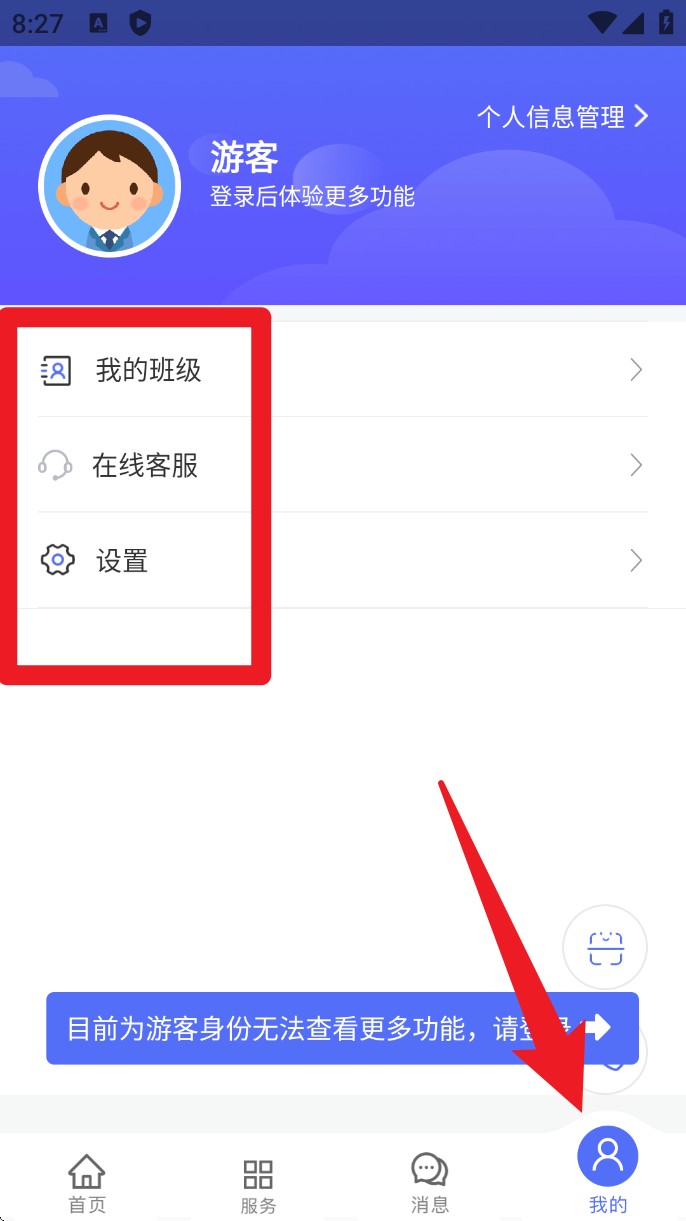 3. 前往“我的”页面可查看班级信息、联系客服或调整设置,登录账号后将解锁更多功能,如查看学生数据与历史记录。