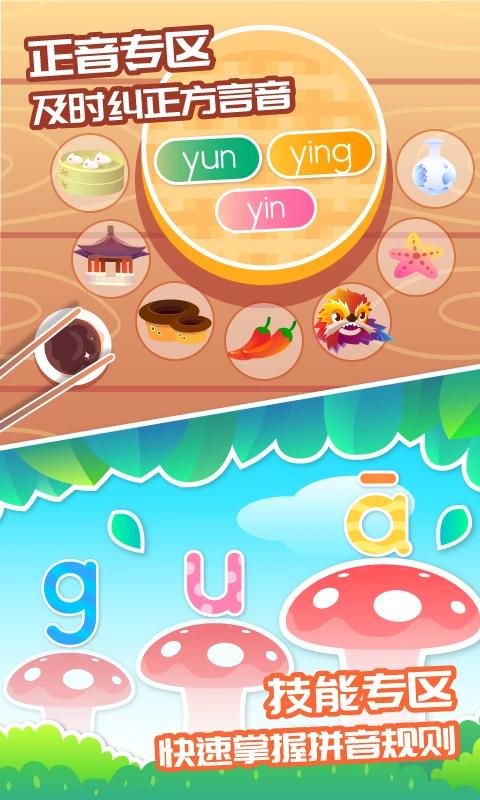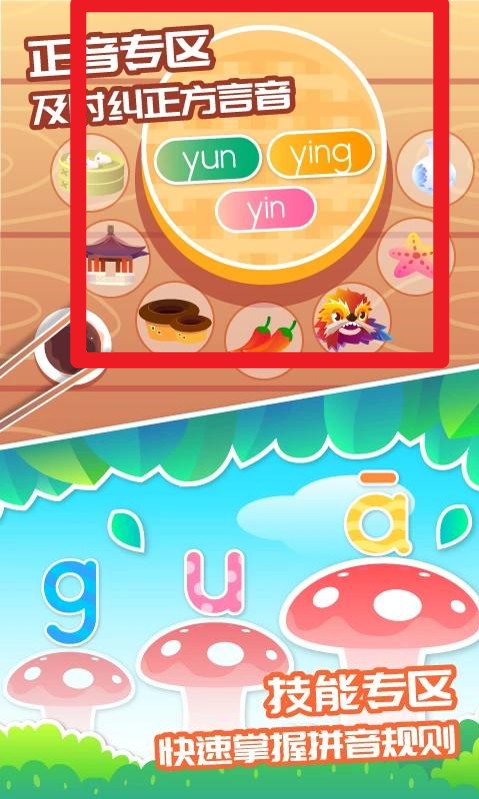3. 点击“正音专区”可纠正发音问题,搭配技能区小游戏,帮助孩子掌握拼音规则,强化学习兴趣。