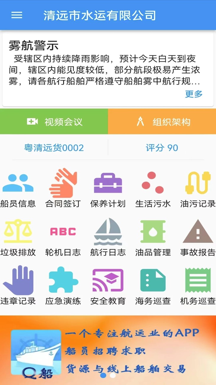 1. 首页提供合同签订、保养计划、日志记录等功能模块,图标清晰直观,方便船员快速进入对应操作界面。