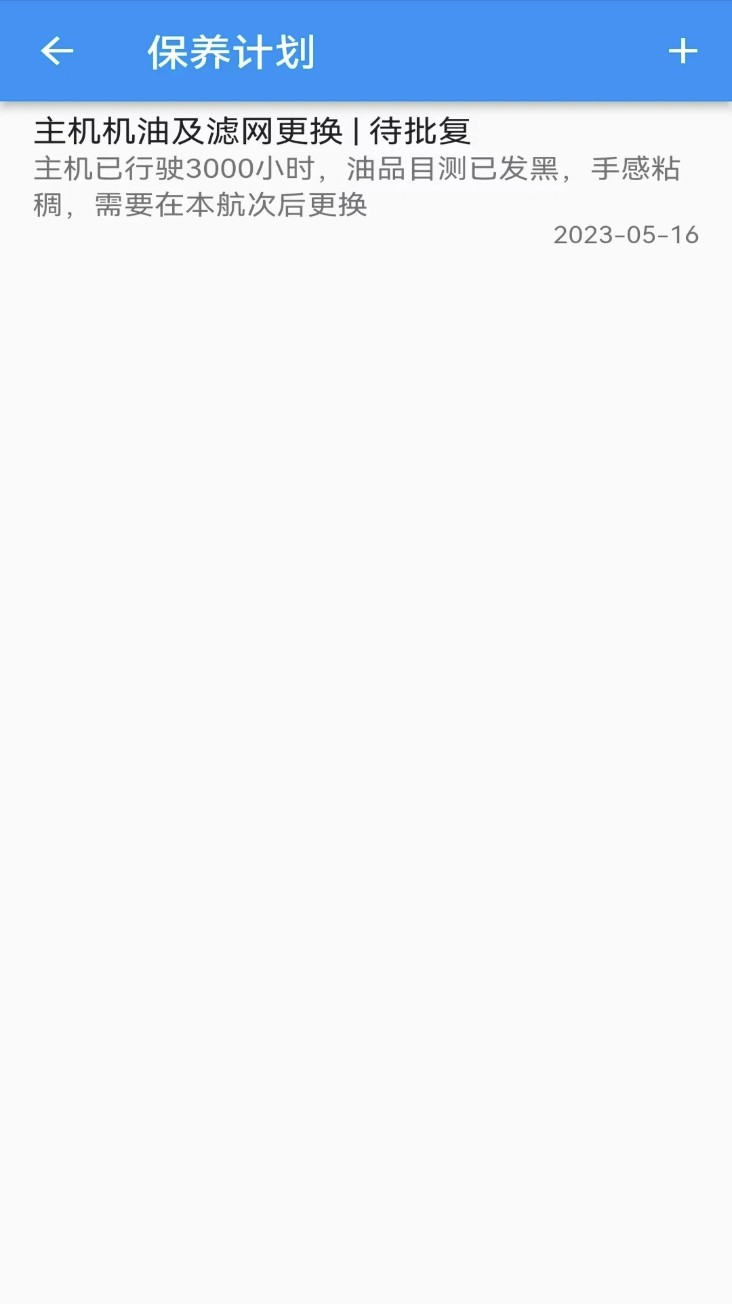 3. 进入“保养计划”页面,可查看主机保养提醒及更换记录,帮助按航次定期维护设备运行状态。
