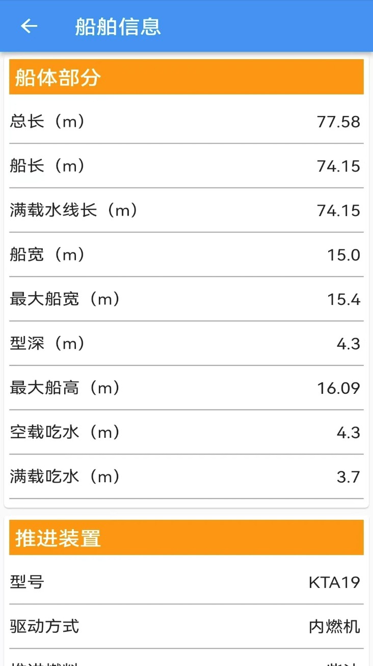2. 点击“船舶信息”可查看船体参数,如总长、型深、吃水及推进装置型号,支持设备识别与船舶管理。