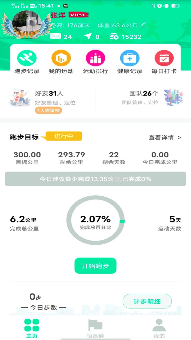 4. 每次完成运动后系统会生成对应记录,回到主页面可查看总公里数、完成率与剩余天数等数据统计。
