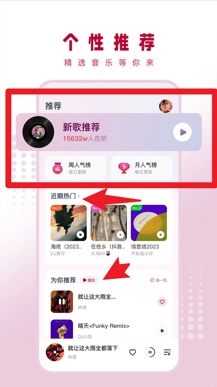 1. 进入首页后点击「新歌推荐」模块,即可试听当下最热新曲,还能查看实时收听人数与热门榜单。