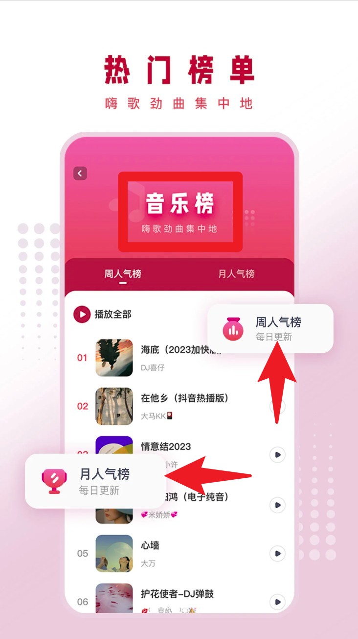 5. 音乐榜单每周更新,支持热门排行、风格精选、主播推荐等多种浏览方式。