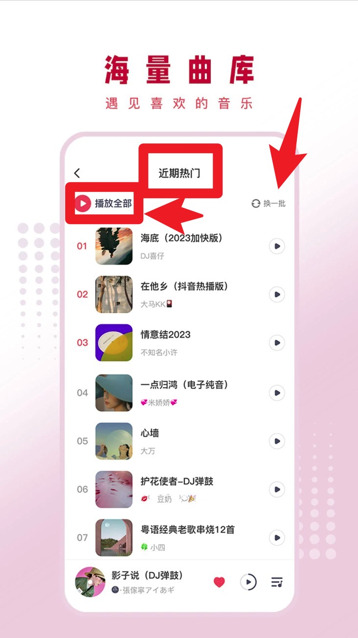 3. 点击右上角的「换一批」按钮,可刷新推荐内容,快速发现更多你可能喜欢的新歌与混音作品。