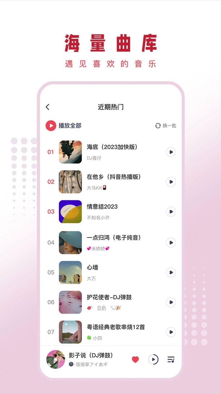 是一款十分火爆的dj音乐播放器,在这里拥有海量的dj曲目和种类,让你随时在线high听,无论是国内红歌还是mc喊麦又或者劲爆dj,这里都有,可在线试听,也可下载保存,十万首dj嗨曲装进你的手机,多线程下载帮你极速收藏好歌。