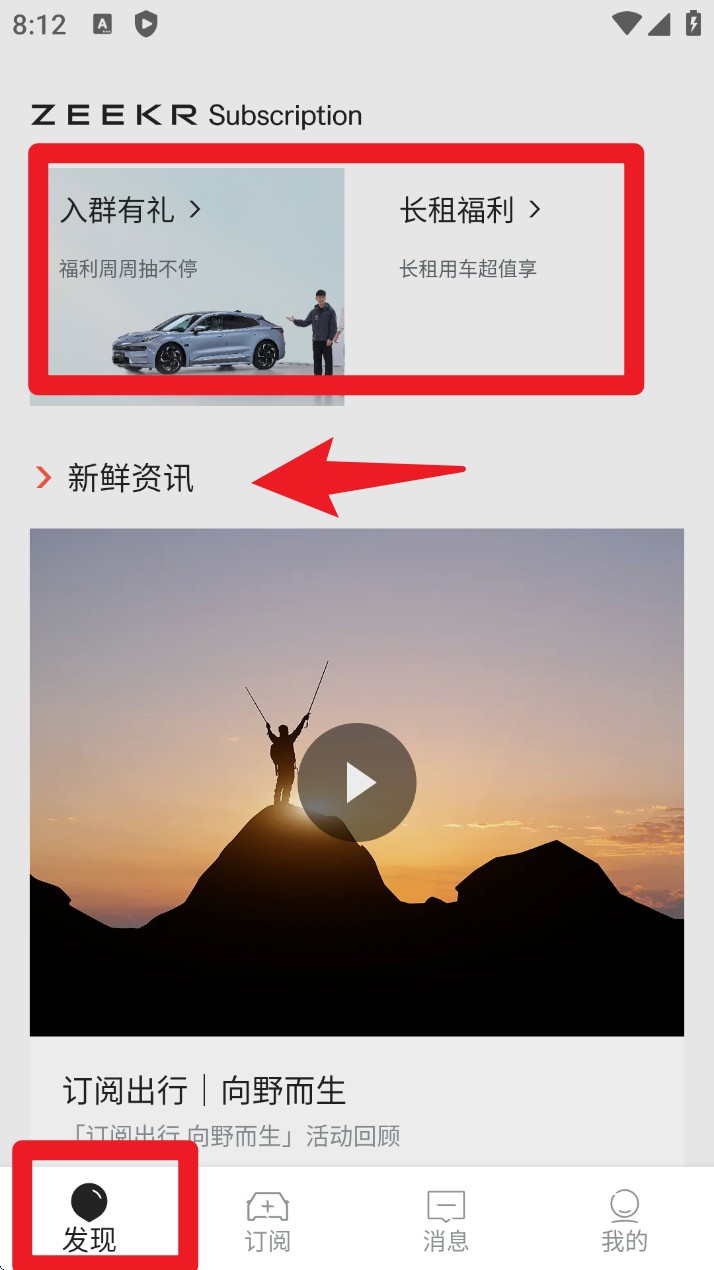 1. 点击底部“发现”按钮,可查看活动资讯、入群福利及订阅相关推荐,获取最新用车信息。