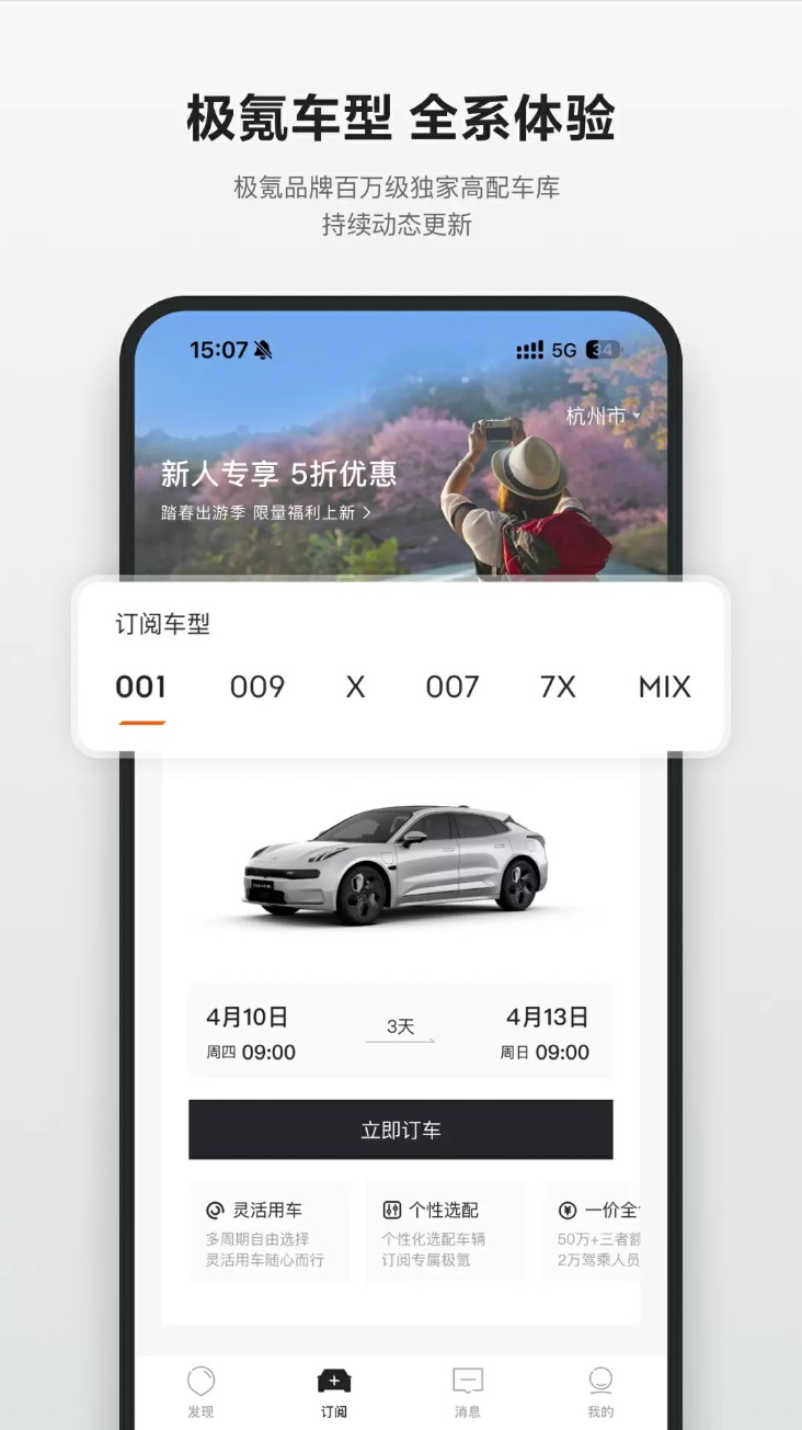 2. 平时不买车,但偶尔想开好一点的,订个一周极氪 007,周末开出去可太有面了。