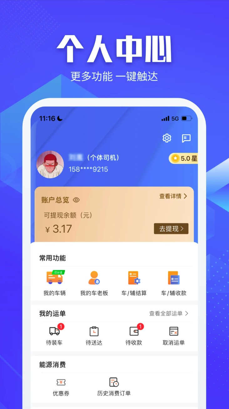 5. 点击右下角进入“个人中心”,可查看账户余额与订单概览,管理车辆、车老板信息与收款记录。