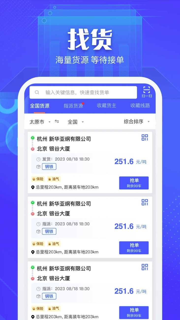 3. 在首页点击“找货”,浏览全国货源列表,支持筛选城市、类型、排序方式,点击“抢单”即可接单。