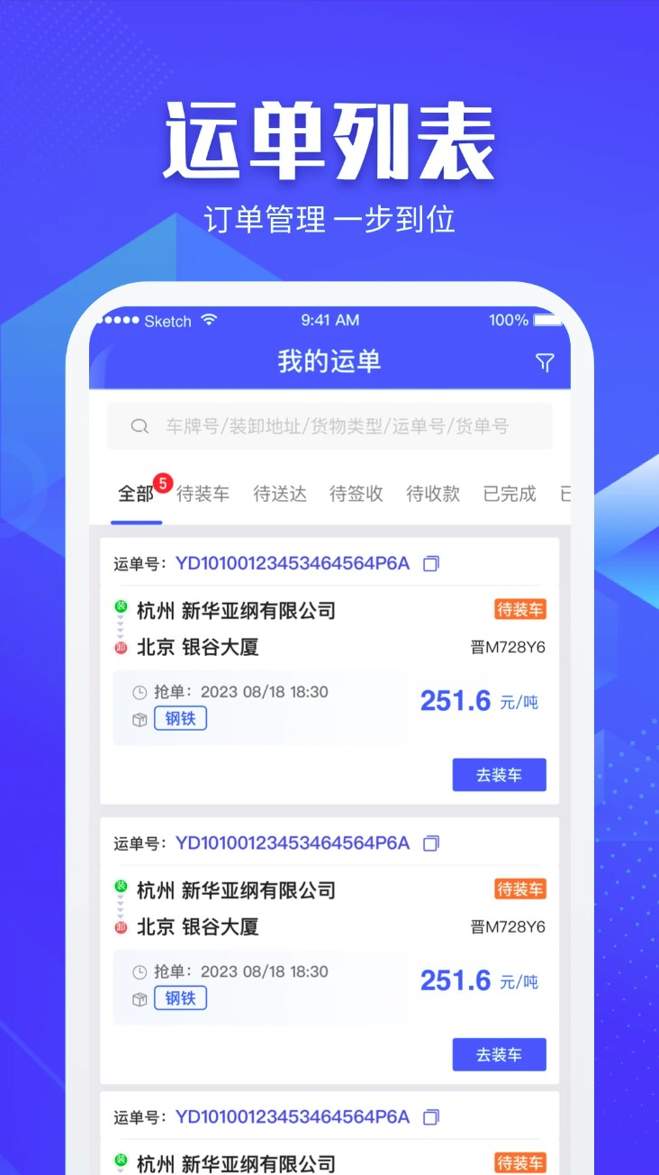 4. 在“我的运单”页面查看当前订单状态,可进行“去装车”“去送达”等操作,随时更新任务进度。