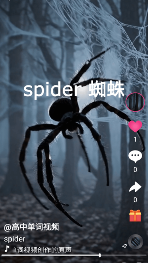 3. 短视频都会配上单词对应的发音与图案,例如spider就会出现蜘蛛,dog就会出现狗。