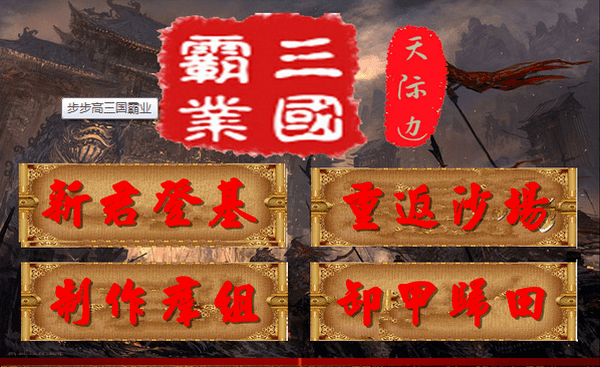 【制作群组】天际边工作室——wstjb 、夕公子、MARTIAN 、YYK【游戏简介】步步高三国霸业安卓版是一款一三国历史为素材的智谋游戏,在游戏中你可以选择君主,按着历史的发展方向,巩固自己的君主地位,其画面真实,美观。