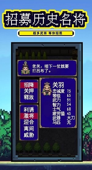 厉害了主公经典复刻吞食天地FC玩法,游戏中非常考验玩家的操作,不断的进行闯关,采用竖屏的游戏方式,轻松的进行战斗,并且玩家还能随意的选择历史名将,选择一位适合的角色能够事半功倍哦,如果你也感兴趣的话,那么不妨来下载尝试一下吧!