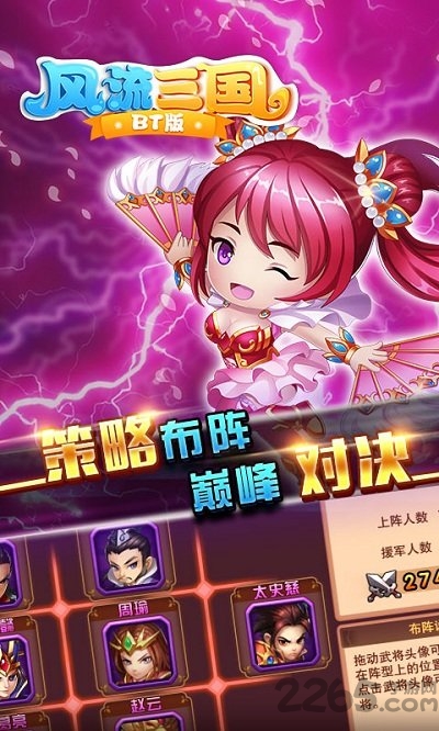 风流三国bt版是全新的三国题材rpg挂机手游!海量三国人物,轻松的挂机战斗,让你横扫千军荡平三国!Q版人物,经典回合战斗,技能克制、缘分羁绊、速度与抵抗等丰富属性彰显顶尖卡牌的策略性.登陆即送海量元宝,七日免费送稀有神器、顶级武将,少年快来加入千万玩家战斗吧!