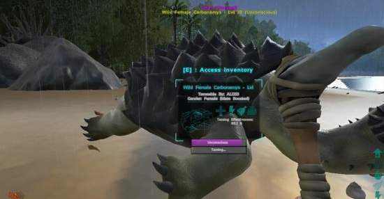 接下来准备阶段到此结束,接下来找到自己想要驯服的恐龙,然后使用拳头,棒子这种钝器来不断攻击恐龙,切记不要使用弓箭这种锐利的武器。