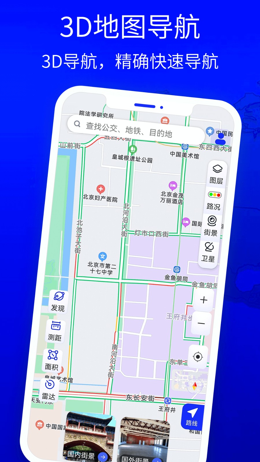 2、主地图界面提供图层、路况、街景、雷达等工具,支持测距、面积计算与POI发现功能操作直观。