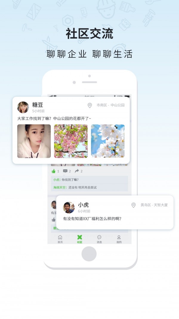 4、求职交流,在社区之中可以聊聊工作、聊聊企业、聊聊生活;
