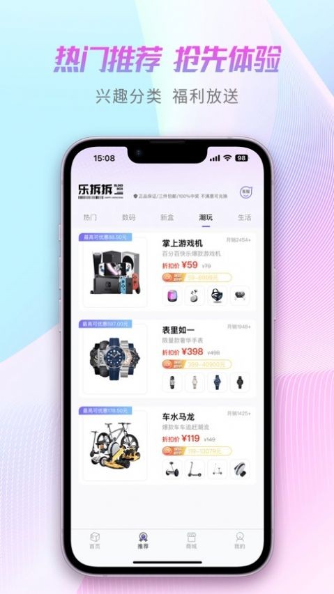 乐拆拆,软件功能十分强大,支持多种盲盒选购模式,满足不同用户的网购需求,带来了更多的优质服务,随时随地在线下单自己需要的商品,超多福利等待你的领取下单,让你购物更加的优惠省钱哦,体验拆盲盒的乐趣。