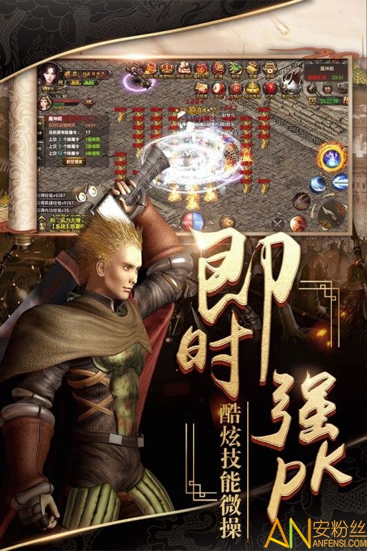 2.其核心玩法是很多玩家非常熟悉的自由PK,战士、法师、道士三职业延续经典,玩家将再次开启久违的热血之路,重温兄弟情谊,怀旧激情年代,剑指沙城,为荣誉为兄弟战到底!