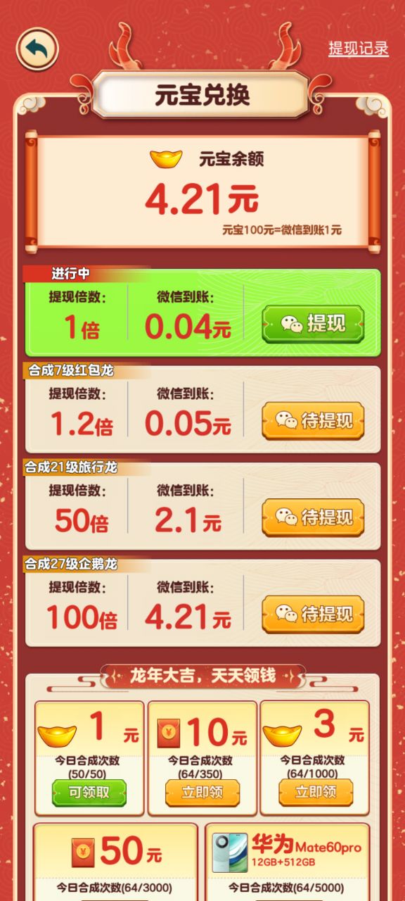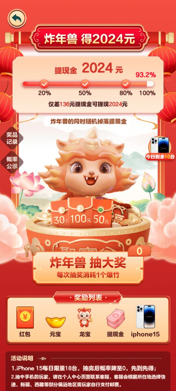 《龙年吉祥》是一款集合成、战斗、收集等多种玩法于一身的手机游戏。游戏画面精美,操作简单易懂,可玩性高。玩家可以通过不断合成更高级的宠物,提升自己的队伍实力;通过派遣自己的宠物队伍去挑战各种强大的敌人,获得胜利后可以获得丰厚的奖励;通过收集各种珍稀宠物,增加游戏的趣味性。同时,游戏内活动丰富,奖励丰厚,可以帮助玩家快速提升实力。总的来说,《龙年吉祥》是一款值得一玩的手机游戏。